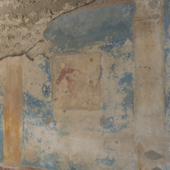 Directly inside the entrance from the Via Stabiana, a set of wall paintings greet the visitor. On the south wall, the central panel of a tripartite friezes depicts three figures, a man, woman, and child, that seem to enter alongside a visitor. The female figure in the center plays a flute, while the man follows behind her, draping his arms over her shoulders. Both wear wreaths around their heads. The small child in front of them carries a walking stick, and looks back at the other two figures. Various scholars have identified this as a wedding scene, an illustration of Ceres and Proserpine Hecate , a scene of theatrical comedy, or a Dionysiac procession (Fig. 1, Pitture e Mosaici: 149). On the opposite north wall, the central panel has been heavily damaged, with the entire top half missing. What is visible of the panel shows two figures, one much larger than the other. This scene has been interpreted as a comedic scene (Fig. 2, Pitture e Mosaici: 145).
