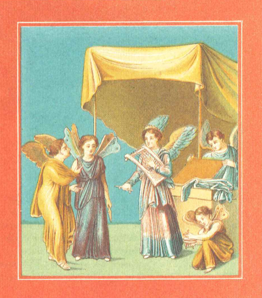 The central panel on the west wall depicts Dionysus leading a procession in an ox-drawn cart (Fig. 3), while to his left a man plays a set of pipes and a large container of liquid is lifted onto the wagon. On the north wall, he is depicted in triumph over a prisoner seated on a pile of weapons in front of him, while Victory writes a triumphal announcement on his shield (Fig. 4). On the south wall (Fig. 5), the strength of Dionysus is again celebrated by demonstrating his ability to conquer even the mighty, but drunken, Hercules. The smaller panels around the room depict cupids listening to instruments, or dancing freely in front of a large, raised statue in the background, or beneath tents (Figs. 6, 7).